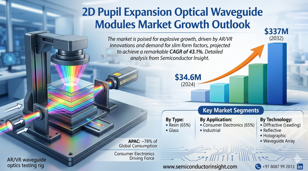 Global 2D Pupil Expansion Optical Waveguide Modules Market, valued at US$ 34.6 million in 2024, is poised for explosive growth, projected to reach US$ 337 million by 2032. This represents a remarkable compound annual growth rate (CAGR) of 43.1%, as detailed in a comprehensive new report published by Semiconductor Insight. The study underscores the pivotal role these advanced optical components play in enabling next-generation augmented and virtual reality experiences, particularly within consumer electronics and industrial applications.