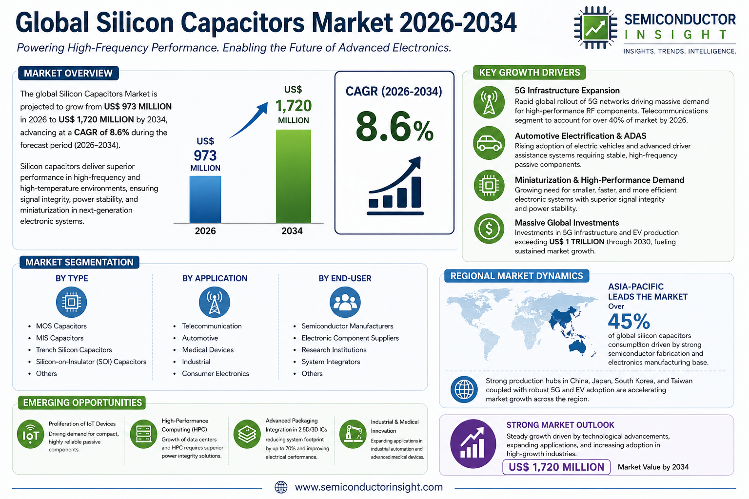 "The massive concentration of semiconductor fabrication and electronics manufacturing in the Asia-Pacific region, which consumes over 45% of global silicon capacitors, is a key factor in the market's dynamism," the report states. With global investments in 5G infrastructure and electric vehicle production exceeding $1 trillion through 2030, the demand for stable, high-frequency, and miniaturized passive components is set to intensify, especially with the transition to advanced network architectures and vehicle autonomy requiring tolerances within femtosecond timing jitter.