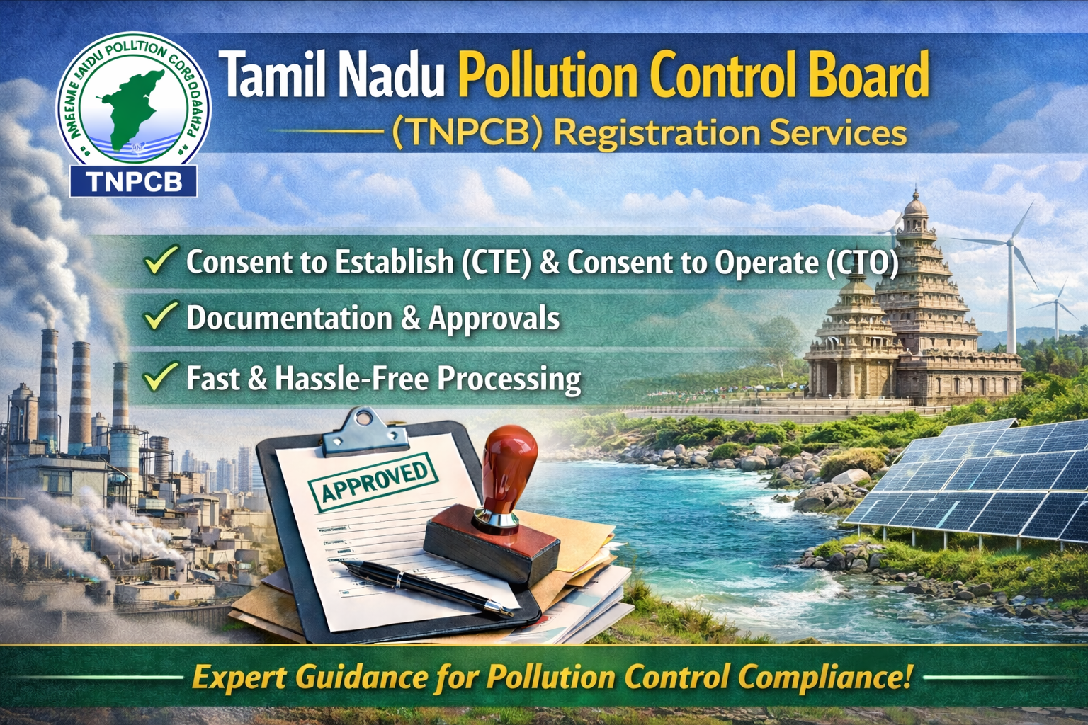 Get expert assistance for TNPCB registration, Consent to Establish (CTE), Consent to Operate (CTO), and compliance services. We help with documentation, application filing, and approvals. Ensure fast processing and hassle-free pollution control registration in Tamil Nadu.