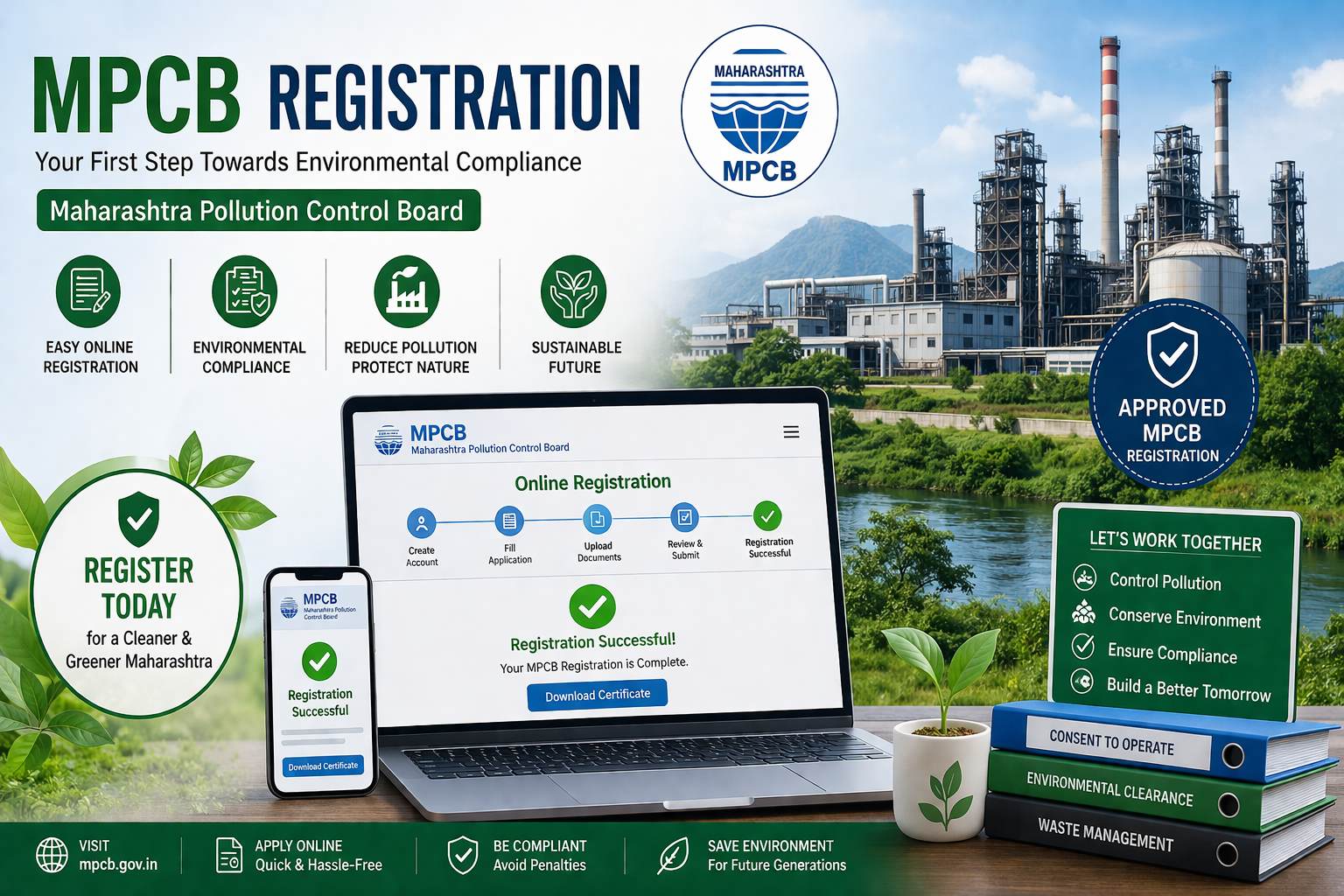 Create an image highlighting MPCB registration and environmental compliance in Maharashtra. Include elements like industrial units, online application interface, pollution monitoring systems, and clean surroundings with greenery and water bodies.